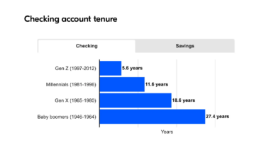 Americans with a checking account have held onto that account for an average of 19 years, while those with a savings account have had it for 17 years, according to Bankrate’s latest Checking Account Survey. The chart below showed some generations keeping their account on average 27.4 years!